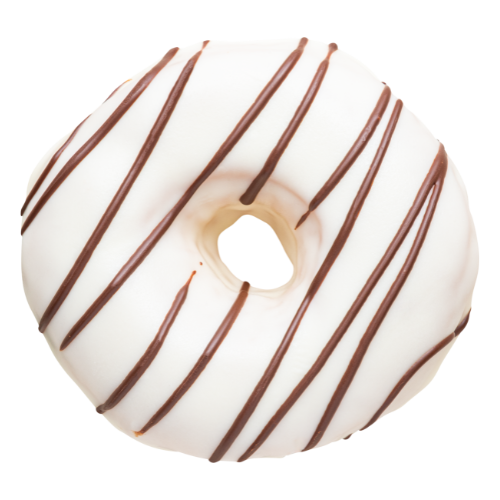 Słodka Zebra to donut o wyjątkowym połączeniu smaków, z nadzieniem waniliowym i czekoladową polewą, ozdobiony charakterystycznym wzorem w paski.